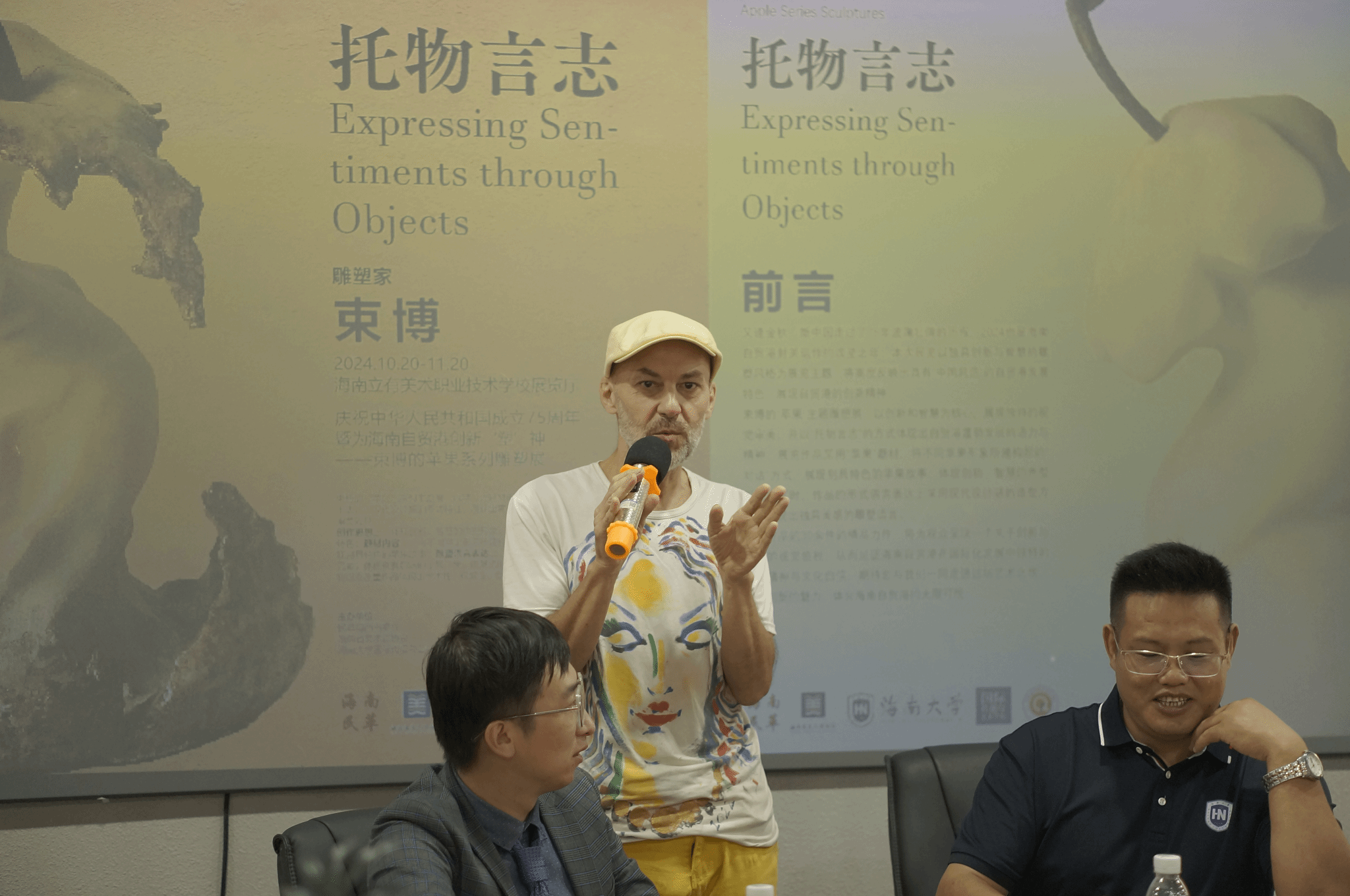 作为此次雕塑展的核心人物,束博在答谢致辞中分享了他的创作灵感与思考。他提到,苹果这一自然物象在他眼中象征着无限的创意与可能性,正与海南自贸港的创新精神相契合。他特别感谢主办方和各界对他作品的肯定,表示艺术不仅是表达形式,更是通过视觉语言与时代对话,助力区域经济与文化的发展。